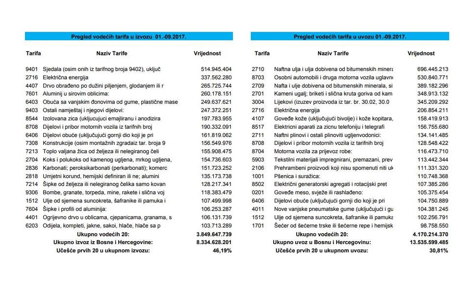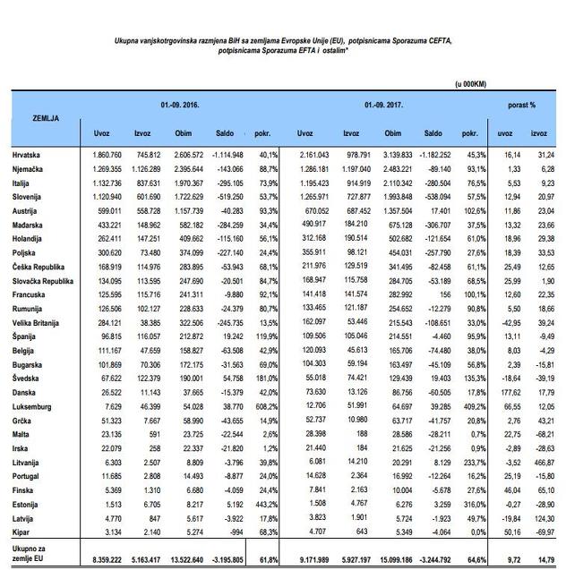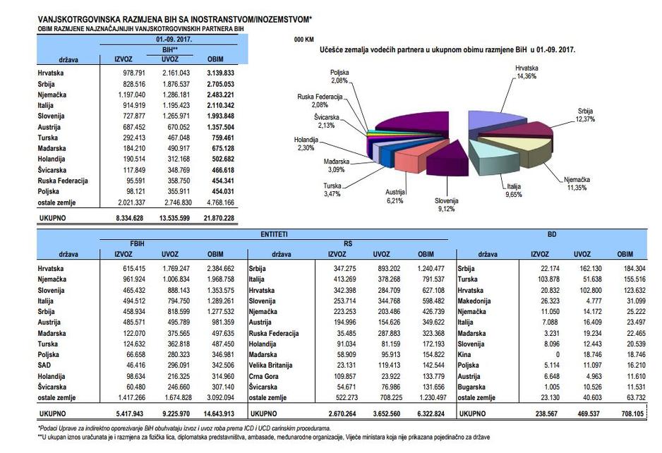 U prvih devet mjeseci ove godine BiH je ostvarila izvoz od 8.334.628 KM, a uvezla robe i usluge u vrijednosti od 13.535.599 KM, što pokazuje da je i dalje veći uvoz. Robe i usluge razmjenjivali smo najviše s Hrvatskom (3.139.833 KM), Srbijom (2.705.053 KM) i Njemačkom (2.483.221 KM).