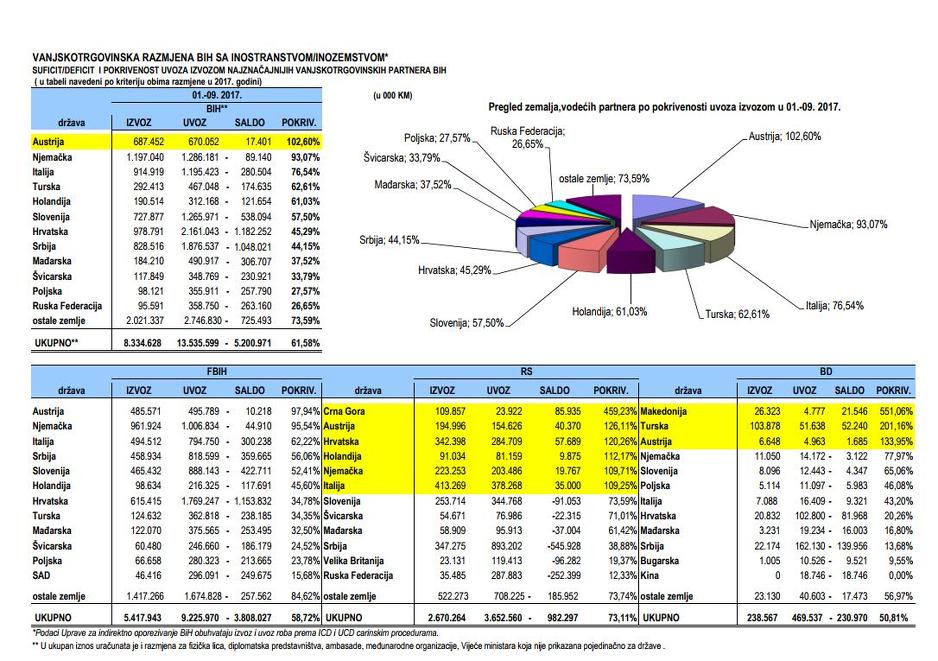 Jedino smo u Austriju više izvezli robe i usluga, nego što smo uvezli i to za 17.401 KM. Gledajući pojedinačno po entitetima, Repulika Srpska ostvaruje veći izvoz u odnosu na uvoz s Crnom Gorom, Austrijom, Hrvatskom, Holandijom, Njemačkom i Italijom. Za razliku od RS-a, FBiH iz svih zemalja više uvozi, nego što izvozi i ostvaruje deficit u vanjskotrgovinskoj razmjeni.