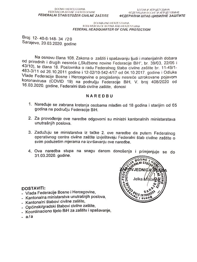 1. Naređuje se zabrana kretanja osobama mlađim od 18 godina i starijim od 65 godina na području Federacije BiH.